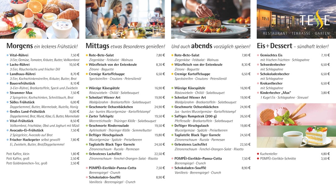 Ob Sie frühstücken, zu Mittag oder zu Abend essen wollen – oder ob Sie einfach nur Appetit auf ein leckeres Essen haben – in der TESSE finden Sie immer das richtige.